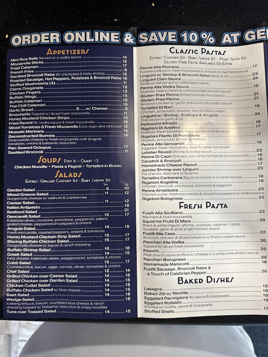 Extras: Chicken $4 Baby Shrimp $5 • Meat Sauce $4 Gluten-Free Pasta Available $3 Extra